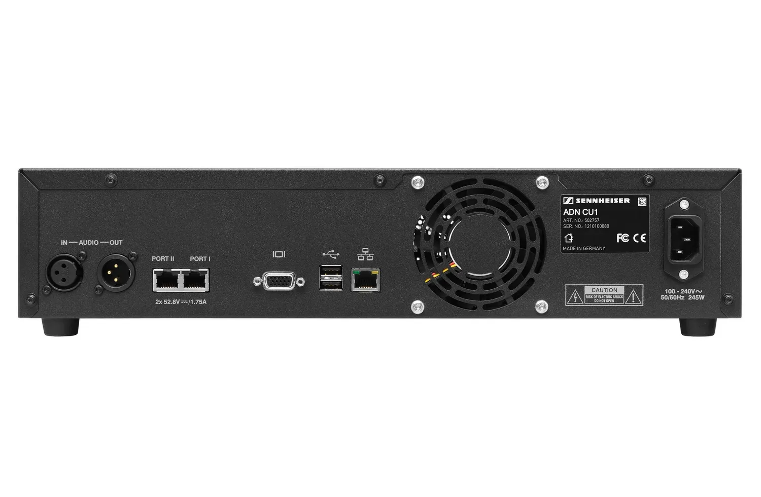 Центральный блок управления Sennheiser ADN CU1-EU поддерживает до 40 пультов делегатов. Система с графическим интерфейсом на 13 языках включает встроенный ПК с программой управления. Есть разъёмы XLR, Ethernet, USB и VGA. Возможно расширение системы до 400 пультов. Функции: удалённый доступ, запись дискуссий, мониторинг ошибок. Передача данных по стандарту EtherCAT.