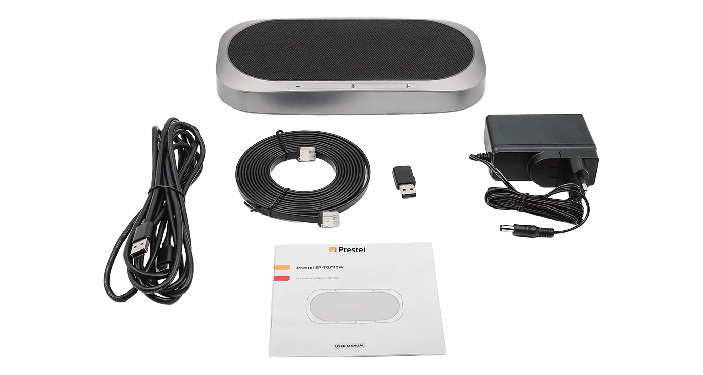 Спикерфон Prestel SP-112W — беспроводной настольный с Bluetooth. 12 микрофонов, радиус действия 5–8 м. Подавление шума и эхо, полный дуплекс, AGC. Подключение до 5 устройств каскадом.