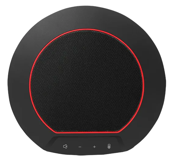 Есть индикаторы состояния: зелёный — устройство работает, мигающий зелёный — отключён громкоговоритель, красный — отключён микрофон, попеременно мигающий — отключены микрофон и громкоговоритель.