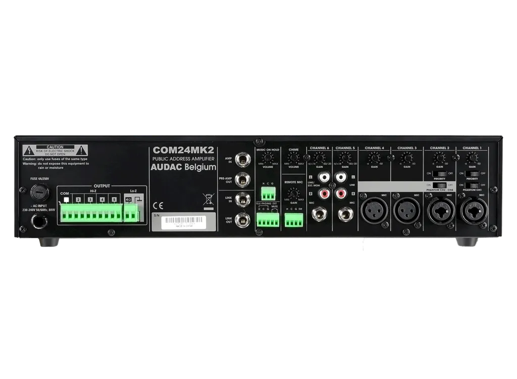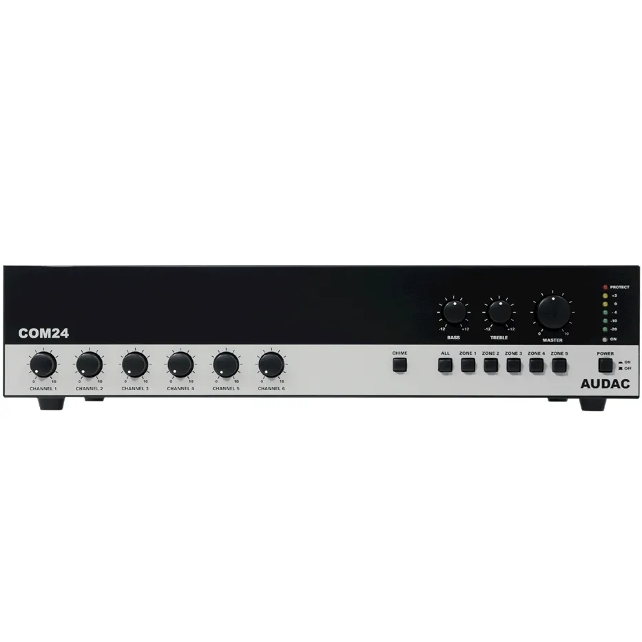 Микшерный усилитель COM24MK2 это надежное устройство, которое предназначено для работы в режиме 24/7. Дополнительную надежность обеспечивает встроенная активная защита от КЗ, перегрева и перегрузки. Питание устройства осуществляется от стандартной сети 220 В AC.