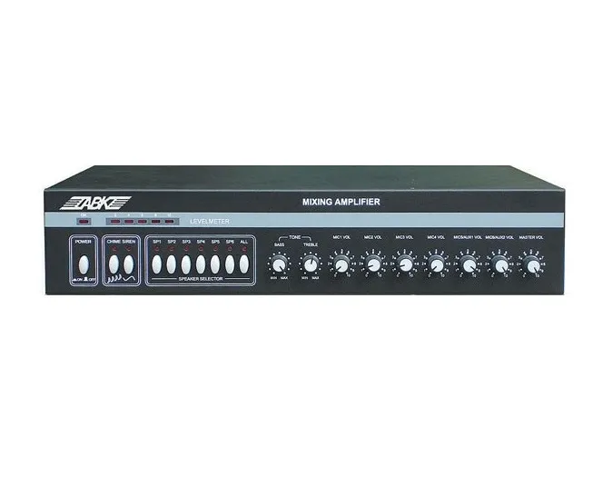 Серия ABK PA - это приборы "все в одном", в них есть встроенный mp3 плеер, тюнер FM/AM, USB-порт, предусилитель, усилитель.Микшер-усилитель ABK PA-3225 имеет ходы: 5 MIC, 2 AUX, 1 REC. Выходы: 1 REC, приоритет функции «заглушка» для звонка и сирены. Три уровня приоритета заглушки: MIC 1 → сирена → звонок. Имеет 5 LED-индикаторов уровня. Независимый регулятор громкости для каждого входа, функции «master bass» и «контроль дискантов». Спикеры: 100В, 70В и 4 Ом. Питание: переменный ток, 220 – 240В или постоянный ток, 24В. Защита от перегрева, перегрузки и короткого замыкания.