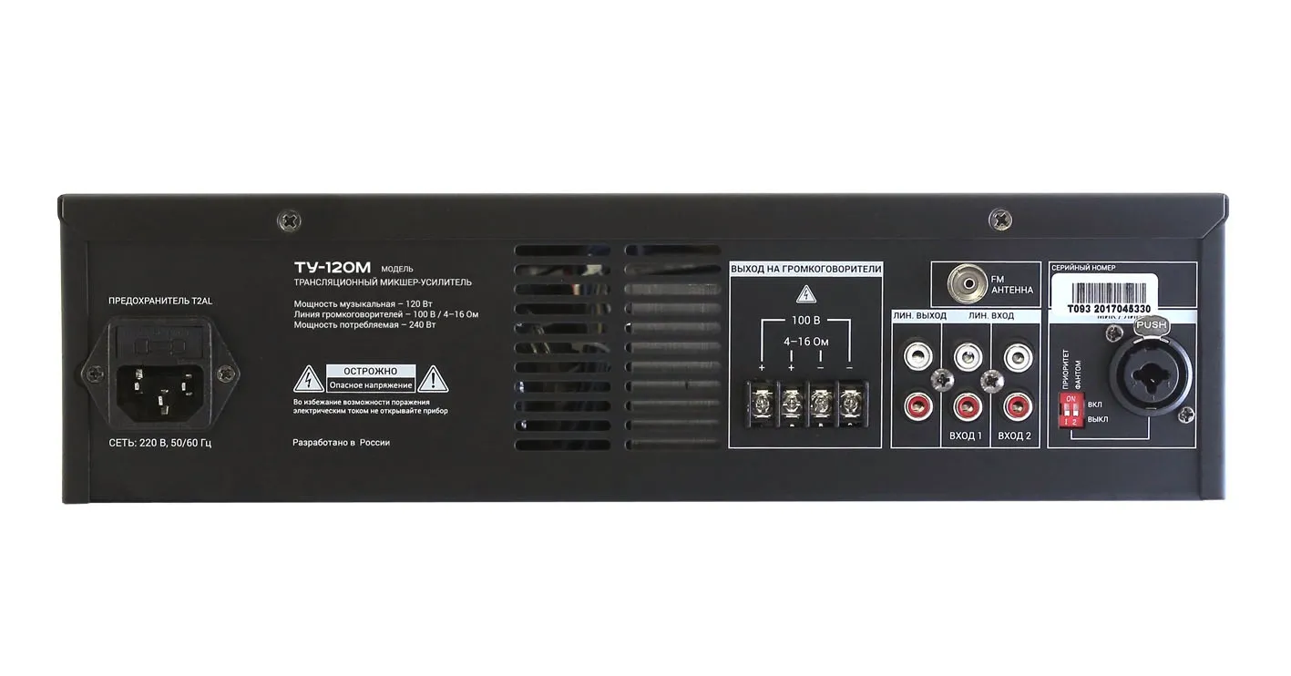 Предназначен для музыкально-речевой трансляции на небольших объектах. Функциональные возможности: Микшер-усилитель со встроенными источниками аудио сигнала: MP3, FM-тюнер, USB, SD; 1 Универсальный (Мик\Лин) и 2 линейных входа с индивидуальной регулировкой громкости; Возможность включения приоритета для универсального входа (Мик\Лин Вход); Возможность включения фантомного питания для микрофонного входа. Выход для подключения линии громкоговорителей с напряжением 100 В или подключения акустических систем с импедансом 4‑16 Ом; Двух полосная эквализация (НЧ и ВЧ); Функция защиты в случае короткого замыкания или перегрузки Рэковое крепление в комплектеХарактеристики и возможности