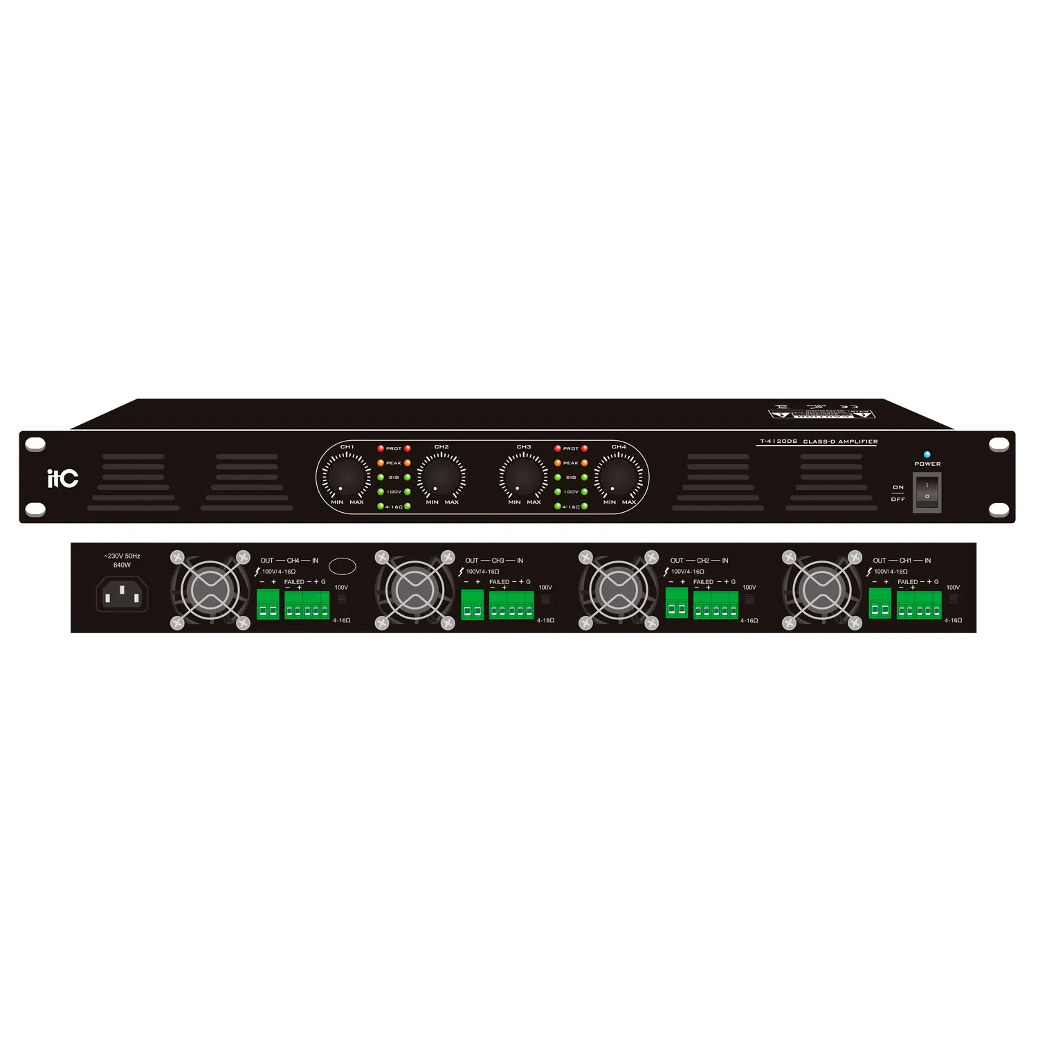 Описание усилителя ITC T-4240DSAITC T-4240DSA — профессиональный четырёхканальный усилитель мощности, подходящий для систем оповещения и воспроизведения фоновой музыки в торговых центрах, ресторанах, клубах и других учреждениях.