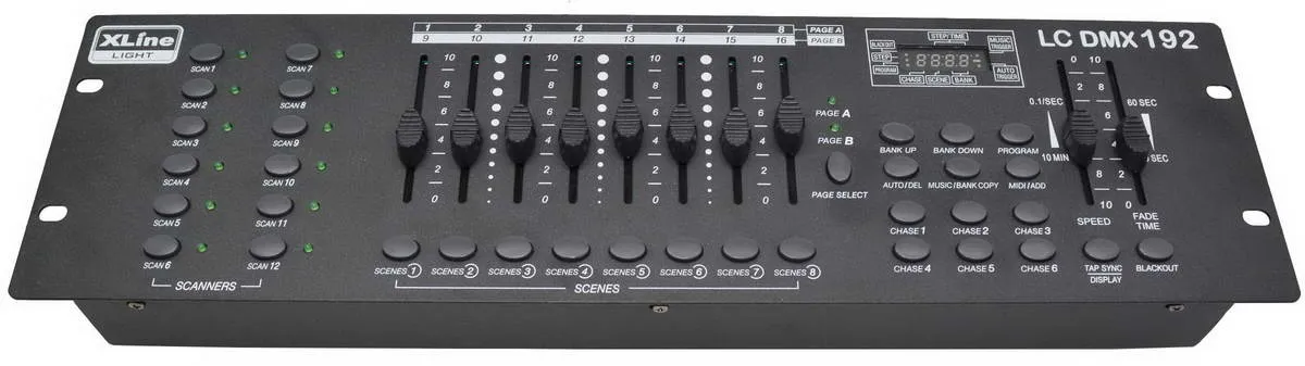 DMX-контроллер XLine Light LC DMX-192 — это 192-канальный пульт для управления 12 приборами. Имеет 8 фейдеров, 30 банков сцен и 6 программируемых чейзов. Поддерживает DMX-512 и MIDI-интерфейс. Питание: DC 9V 500 mA. Подключение: 3-pin XLR, MIDI, USB. Размеры: 482 x 133 x 75 мм (3U в 19" рэке). Вес: не указан. Производство: Китай.
