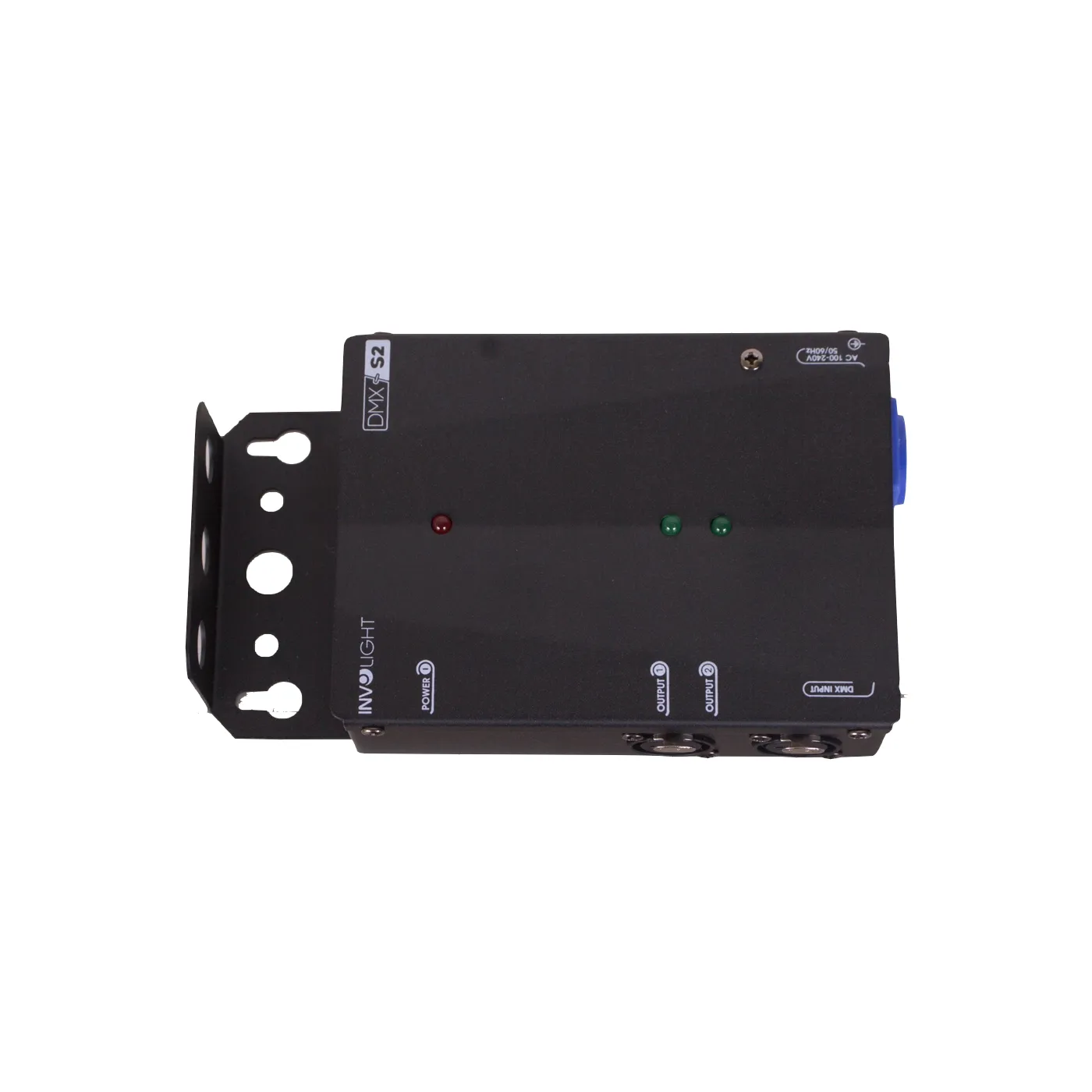 DMXS2 от Involight — 2-канальный DMX-сплиттер с одним входом и двумя выходами. У каждого выхода есть независимый трансформатор. Разъём — трёхконтактный XLR. Питание: AC100–240В, 50/60Гц.