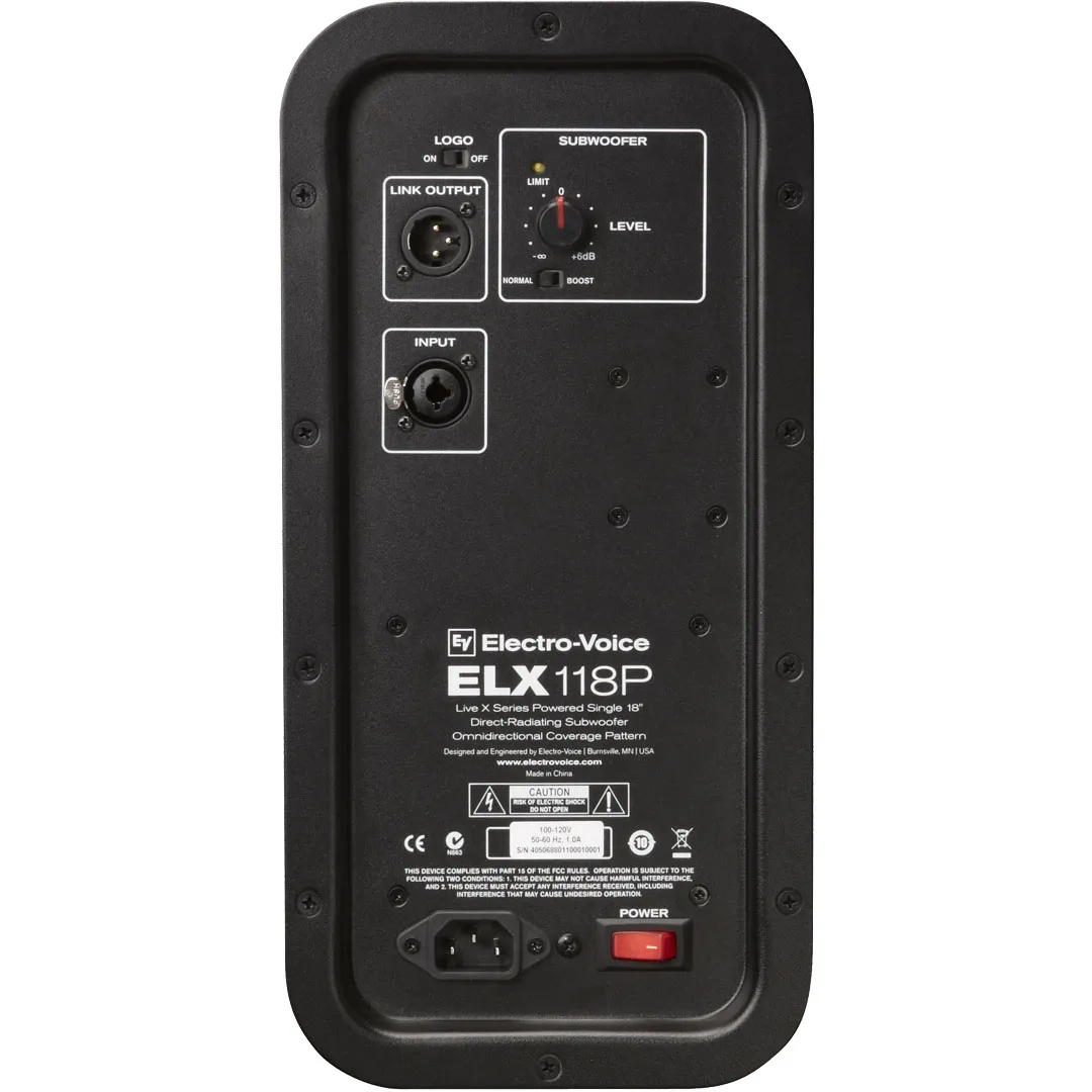 Активный сабвуфер ELECTRO VOICE ELX118P — мощный инструмент для усиления низких частот. Усилители D-класса (700 Вт) и НЧ-драйвер (EVS-18K) обеспечивают стабильную работу и качественное звучание. Мощность — 400 Вт, пиковая — 1600 Вт. Частотный диапазон: 42–100 Гц (-3 дБ) и 32–130 Гц (-10 дБ). Корпус из многослойной фанеры, чёрное порошковое покрытие. Габариты: 661 х 507 х 574 мм, вес — 31,3 кг.