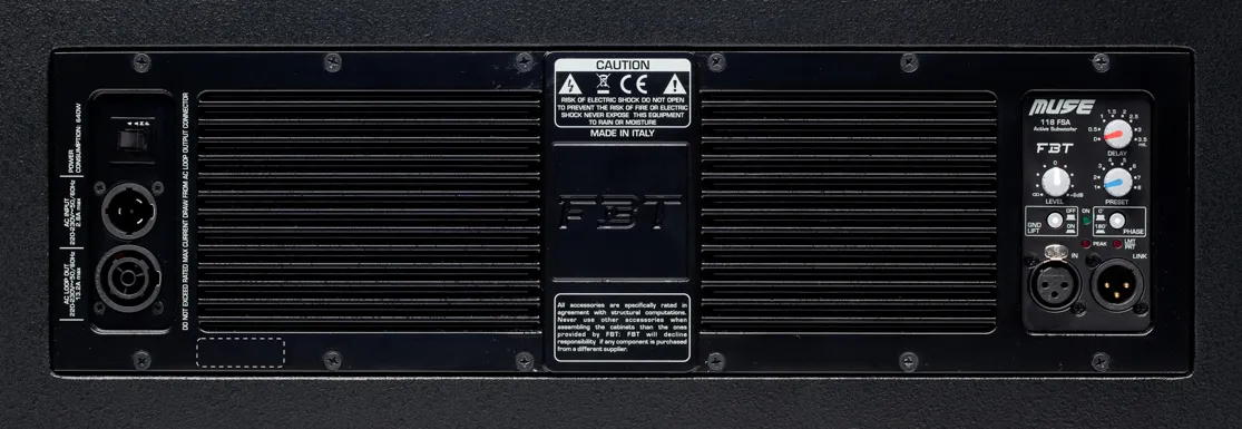 Активный сабвуфер FBT Muse 118FSA специально разработан для использования с элементами линейного массива FBT MUSE 210LA. Гибридная конфигурация кабинета позволяет распределить давления создаваемое 18-дюймовым динамиком B&C Speakers внутри АС между фазоинвертором и пассивным излучателем (диффузором). FBT Muse 118FSA оснащен цифровым усилителем мощности и DSP-процессором для настройки звучания. Корпус из березовой фанеры имеет интегрированную систему подвеса и четыре алюминиевые ручки для переноски. Сабвуфер может также использоваться в кардиоидных стэках для точного контроля басового сигнала.В интернет-магазине Lightdec Вы можете купить сабвуфер FBT MUSE 118FSA по доступной цене. Если у Вас остались вопросы или требуется помощь в подборе оборудования, оставьте заявку, и наши специалисты свяжутся с Вами.