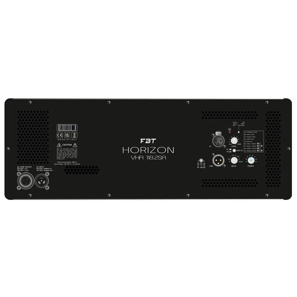 Сабвуфер FBT VHA 118.2 SA генерирует мощное звучание с уровнем 143 дБ. Оснащён усилителем класса D и DSP-процессором. Мощность — 2500 Вт.