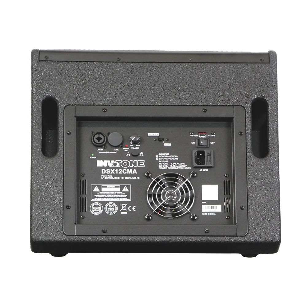 Invotone DSX12CMA — активный сценический монитор с широким диапазоном частот (60 Гц – 20 кГц). Оснащён двумя усилителями, ВЧ-динамиком 1" и НЧ-динамиком 12". Максимальное давление звука — 121 дБ. Угол раскрытия — 70°. Управление включает регулятор уровня, переключатель режимов, входы XLR/Jack и другие функции. Защищён от перегрева и перепадов напряжения. Корпус из берёзовой фанеры с ручками и стаканом для стойки.