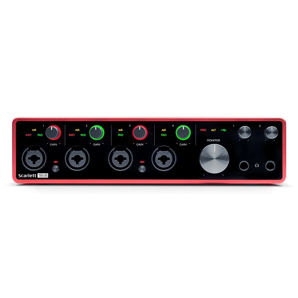 Описание аудиоинтерфейсаАудиоинтерфейс FOCUSRITE Scarlett 18i8 3rd Gen — настольный девайс с подключением USB типа C и протоколом USB 2.0. Поддерживает одновременное использование 18 входов и 8 выходов. Разрешение АЦП составляет 24 бит / 192 кГц. Имеет 4 предусилителя и 4 пэда, поддерживает фантомное питание. Оснащён 2 инструментальными и 8 линейными входами, 4 аналоговыми выходами и 2 выходами на наушники. Поддерживает переключение между акустическими системами через ПО, а также имеет входы и выходы S/PDIF, ADAT и MIDI.