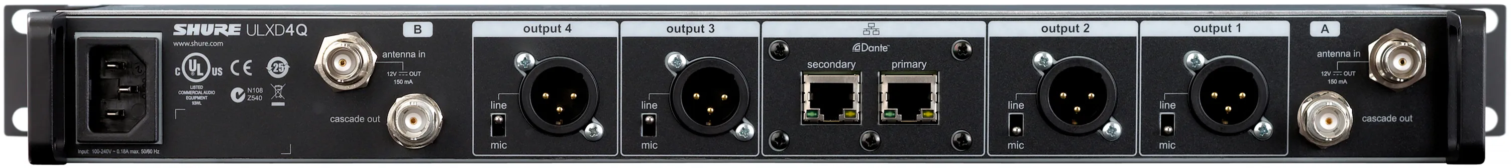 Shure ULXD4QE G51 — четырёхканальный беспроводной приёмник. Работает в диапазоне 470–534 МГц. Поддерживает шифрование AES 256 bit, автоматическое нахождение свободной частоты.