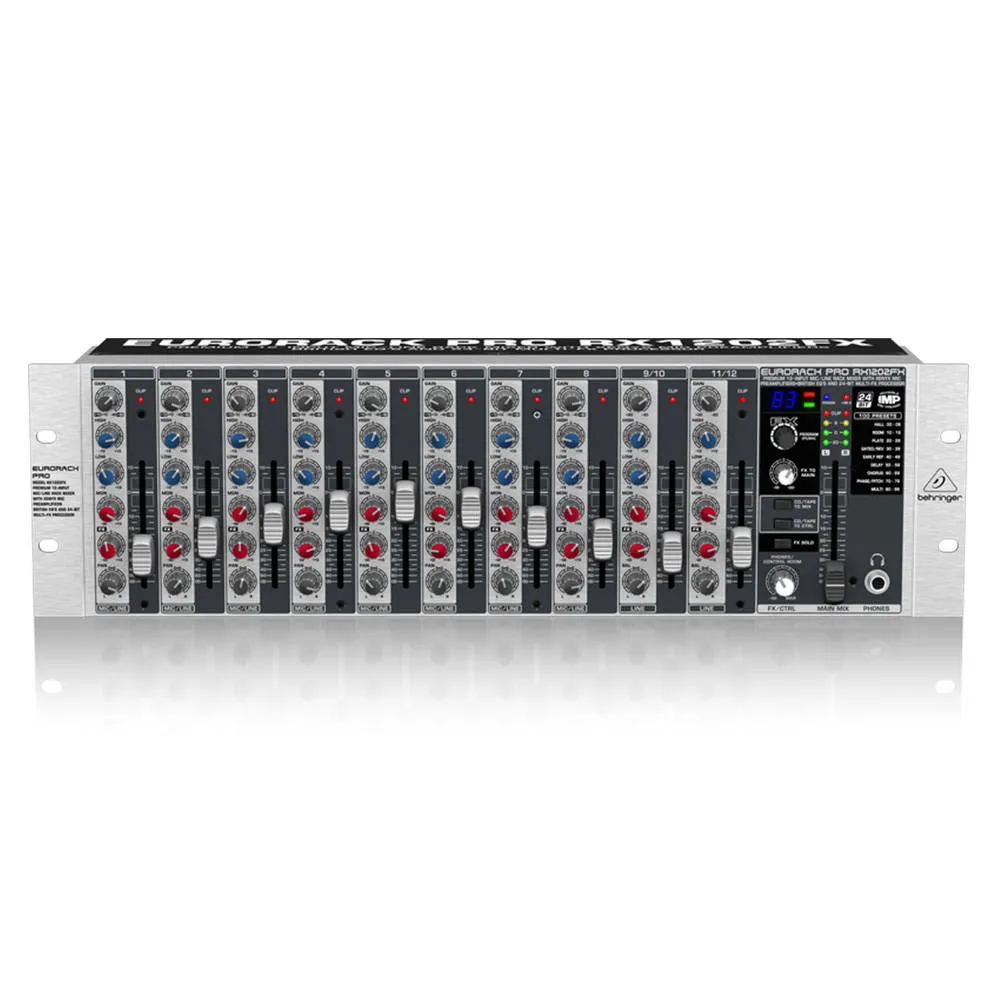 Behringer RX1202FX V2 — рэковый микшерный пульт серии Eurorack Pro, версия 2. Обновлённая модель 12-канального микшера с 8 моно-каналами и 2 стереопарами. Встроенным FX-процессором и фантомным питанием +48 В. Поддерживает установку в 19-дюймовую стойку (3 юнита).