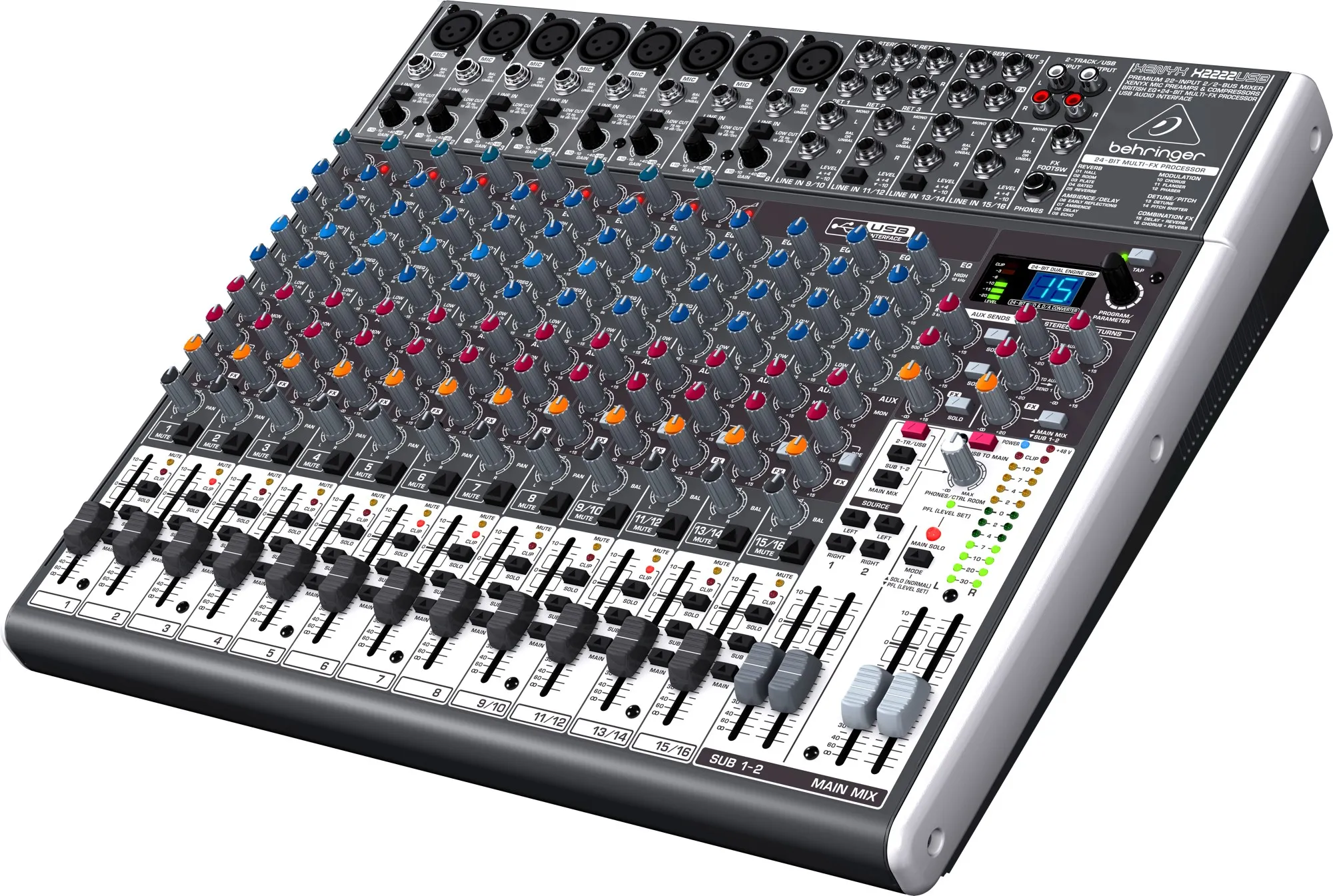 Одним и главных отличий BEHRINGER X2222USB – это 3-полосные «британские» эквалайзеры, благодаря которому создается теплое и музыкальное звучание с полупараметрической серединой.