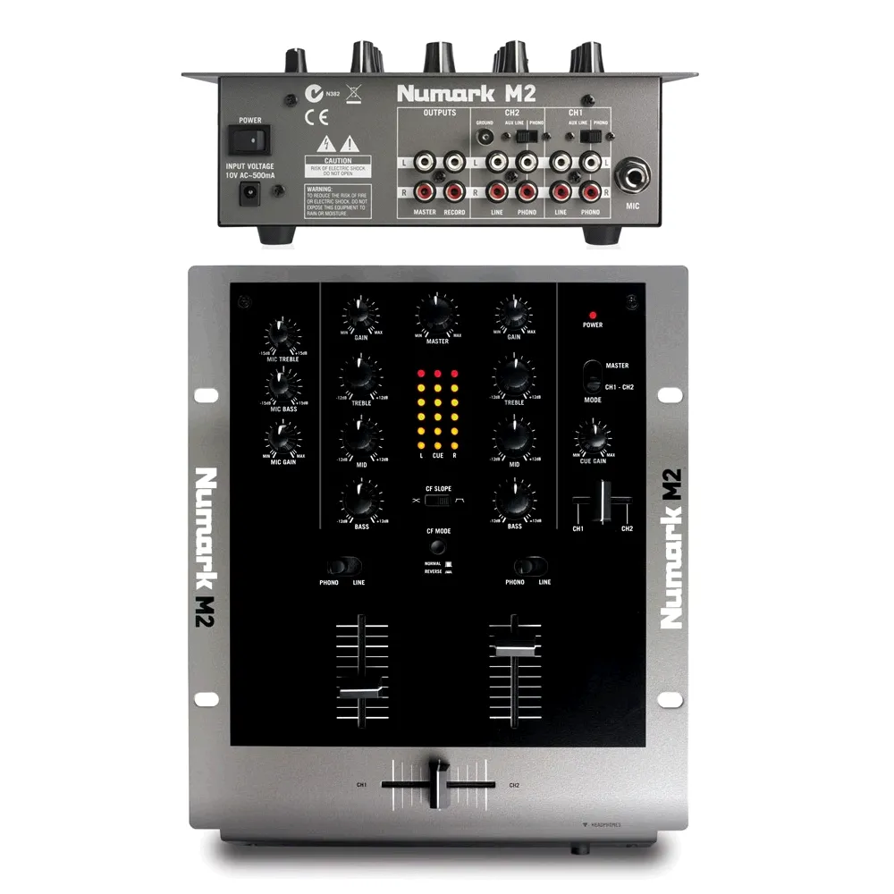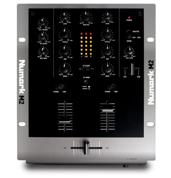Numark М2 двухканальный DJ Scratch микшер который оснащен всем необходимым. Особенности: 2 линии / 2 phono + 1 микрофон, трехполосный эквалайзер на канал, индикация сигнала PFL, мастер-выход, record, миникроссфейдер, переключатели реверса режимов и кроссфейдера. Переключаемые входа для проигрывателей, различных линейных источников. Микрофонный вход с отдельным эквалайзером, выход на наушники.Характеристики